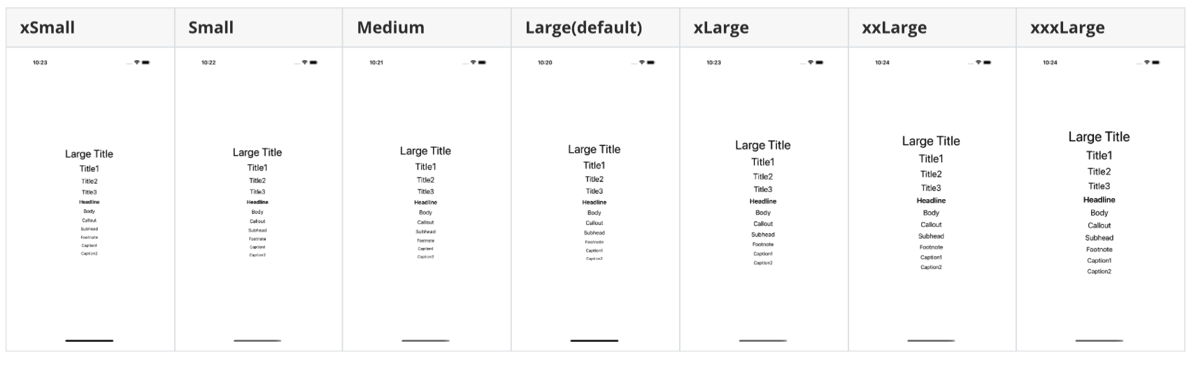 아래 표는 iPhone 12 Pro에서 Setting > Accessibility > Display&Text Size > Larger Text로 들어가서 조정을 할 경우 보이는 글씨입니다.